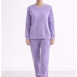 - Ženska dvodelna pižama iz frotirja (82% bombaž, 18% elastan) sestavljena iz udobne majice z dolgimi rokavi, ter dolgimi hlačami z mehko elastiko ter s patenti na rokah in nogah.